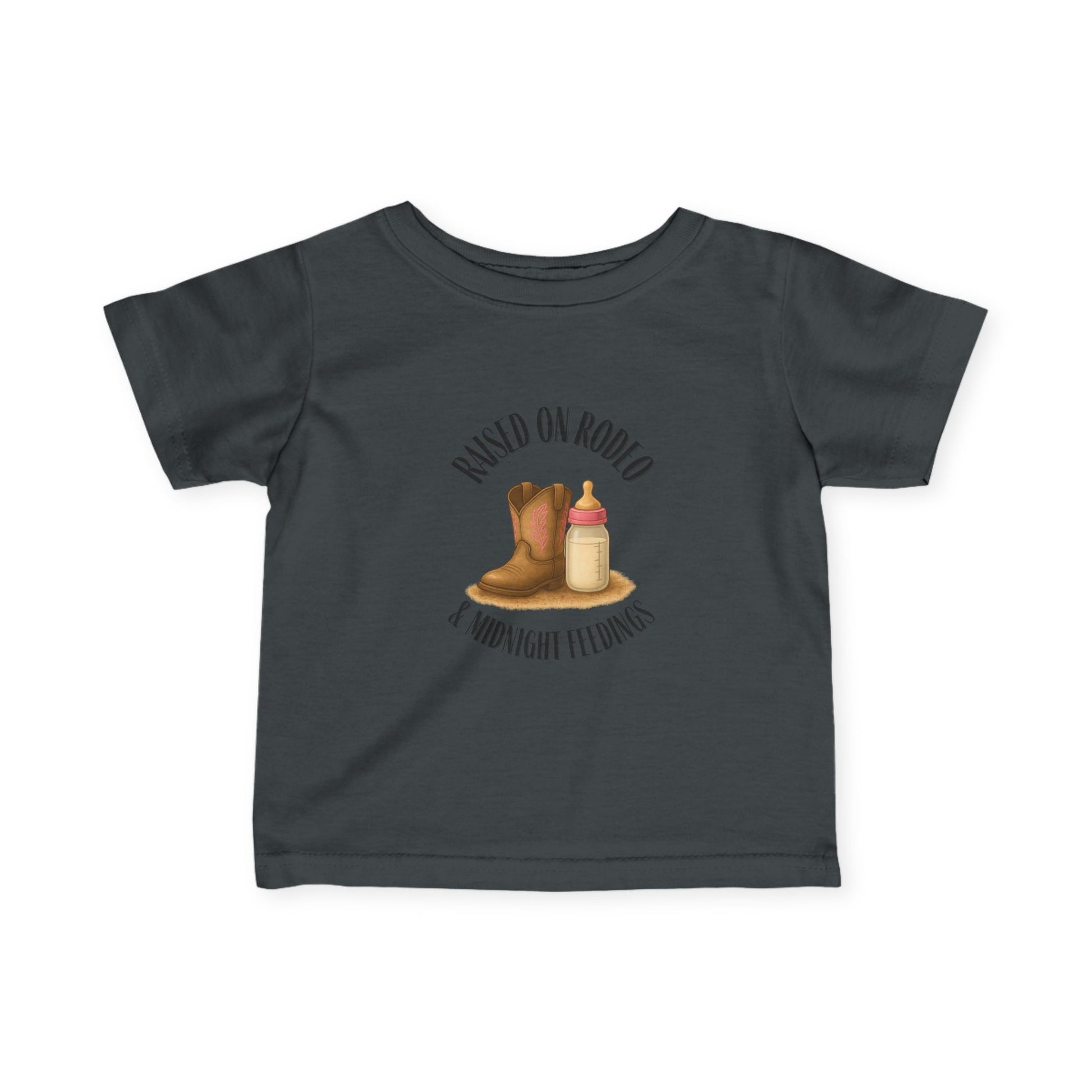 Raised on Rodeo & Midnight Feedings – Infant Girl Western Rodeo T-Shirt (6M–24M, Cowgirl Baby Tee)